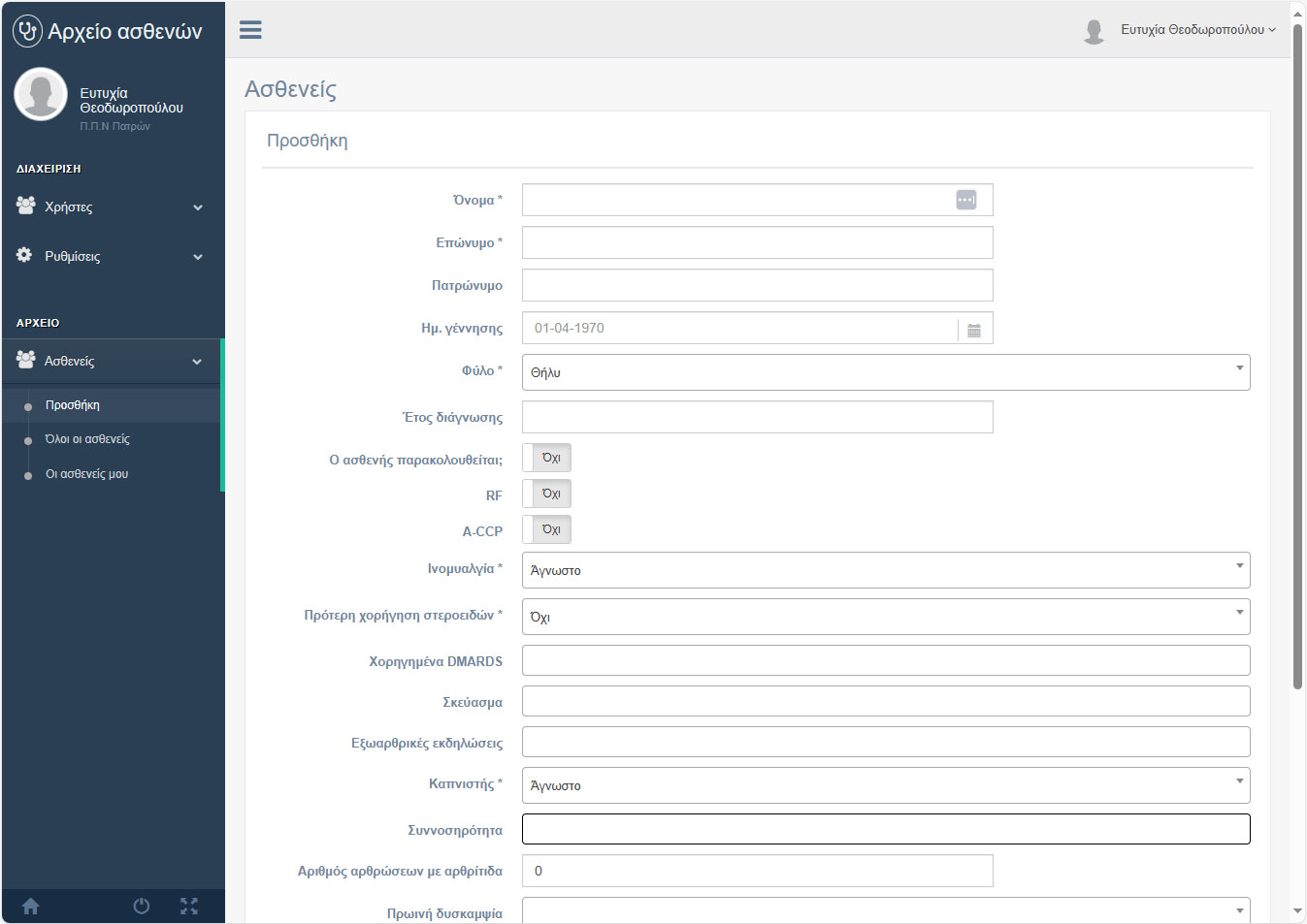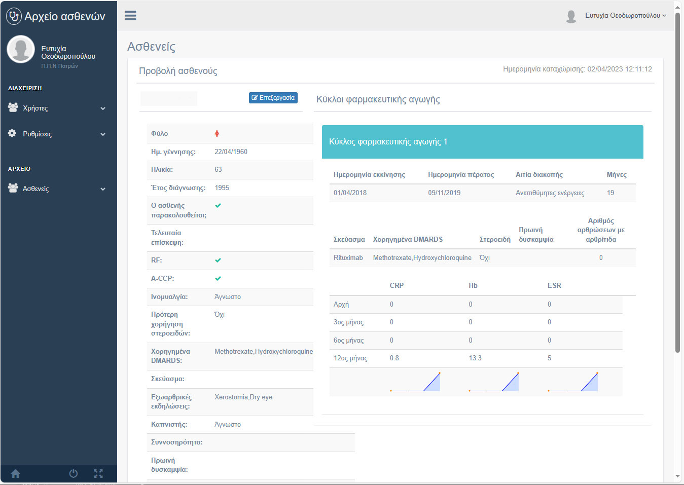 The data stored in the information system for each patient include, but are not limited to, a comprehensive set of fields that are crucial for effective RA management and research. These fields encompass basic demographic information such as Gender, Date of Birth, and Age. Medical history and treatment details are meticulously recorded, including the Year of Diagnosis, whether the patient is currently being monitored, the date of the Last Visit, and specific markers like Rheumatoid Factor (RF), Anti-Cyclic Citrullinated Peptide (A-CCP), and indicators of Fibromyalgia. Previous administrations of steroids, as well as administered DMARDs (Disease-Modifying Antirheumatic Drugs), are tracked, along with the specific Formulations used. The system also notes Extra-articular manifestations, whether the patient is a Smoker, and any Comorbidities. Critical to treatment analysis are data points like Morning stiffness, the Number of joints with arthritis, and key lab results including C-Reactive Protein (CRP), Hemoglobin (Hb), and Erythrocyte Sedimentation Rate (ESR). Additionally, detailed records of each Therapeutic treatment cycle are maintained, encompassing the Start and End Dates, Reasons for discontinuation, and duration in Months. This comprehensive dataset provides a robust foundation for personalized patient care and advanced RA research.